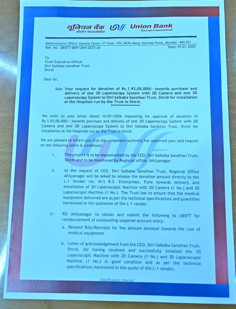 अशाच प्रकारे आज युनियन बँक ऑफ इंडिया यांच्या CSR निधीतून श्री साईबाबा संस्थानच्या दोन्ही रुग्णालयांसाठी एकूण ₹१ कोटी ९३ लाख किमतीची २ नग अत्याधुनिक 3D नेफ्रोस्कोपी व 2D कॅमेरा यंत्रे देणगी स्वरूपात प्रदान करण्यात आली आहेत, अशी माहिती संस्थानचे मुख्य कार्यकारी अधिकारी श्री. गोरक्ष गाडीलकर (भा.प्र.से.) यांनी दिली.