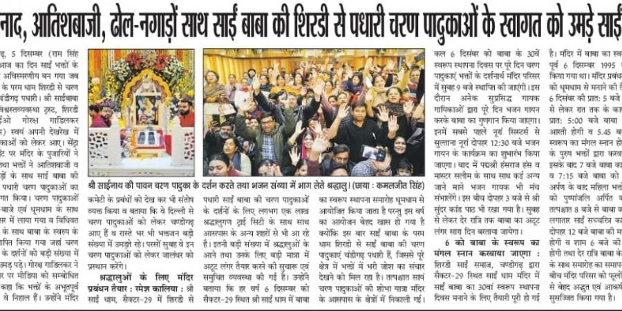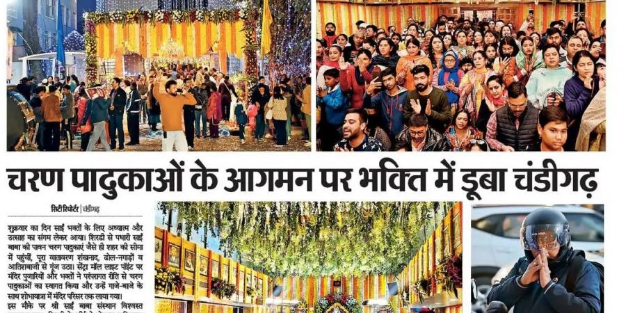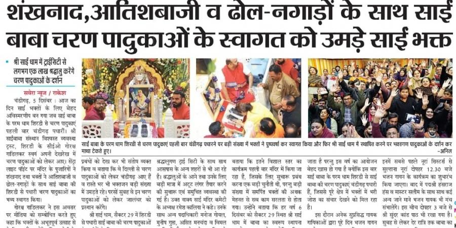 चंडीगढ़ में भव्य स्वागत कल ०५ दिसंबर को जब पादुकाएँ चंडीगढ़ पहुँचीं, तो भजन, ढोल-ताशा, झांझ-मंजीरा, फूलों की वर्षा, स्वागत जुलूस जैसे भव्य समारोह में श्री का स्वागत किया गया। स्थानीय भक्तगण, विभिन्न सामाजिक संस्थाओं, महिला मंडलों, युवा संगठनों, वरिष्ठ नागरिकों, छात्रों जैसे सभी वर्गों के नागरिकों ने बड़े भक्तिभाव से श्री की पादुकाओं के दर्शन किए।