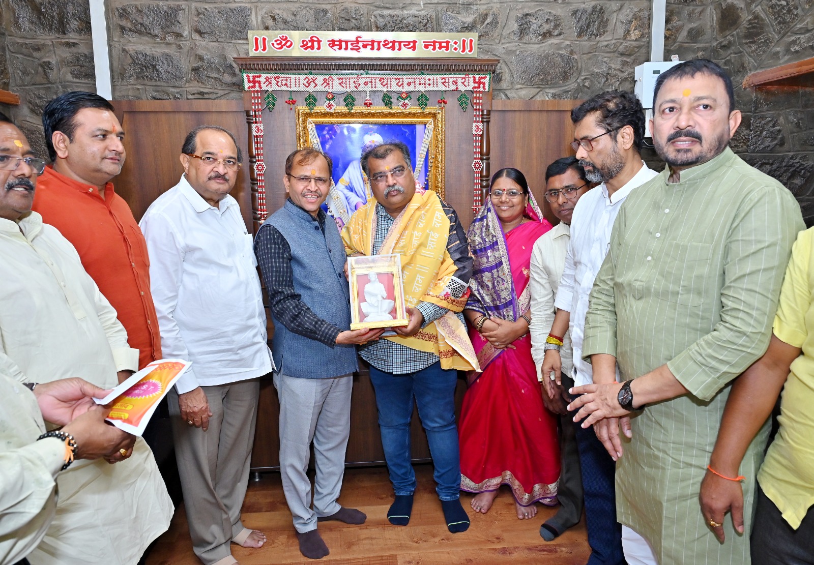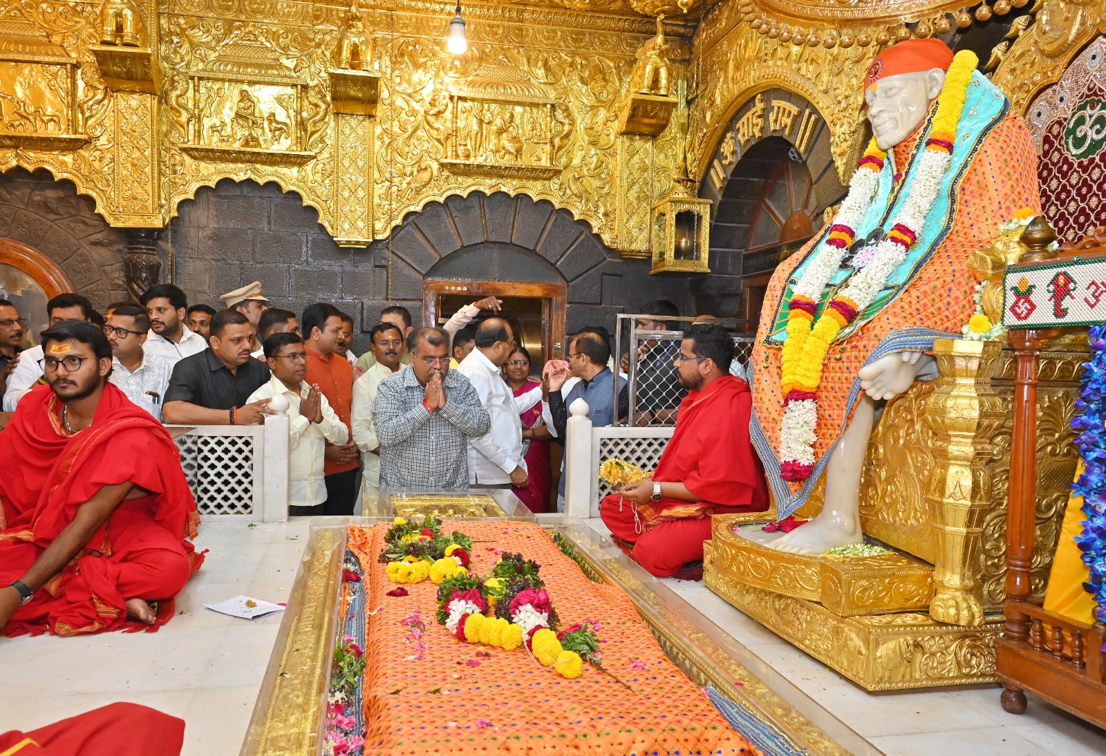 Hon. MLA Ravindra Chavan, BJP State President, Maharashtra, and Hon. Minister Radhakrishna Vikhe-Patil, Water Resources Minister and Guardian Minister of Ahilyanagar, visited and offered prayers at the Samadhi of Shri Saibaba. Following the darshan, they were felicitated by Goraksha Gadilkar (IAS), Chief Executive Officer, on behalf of the Shri Saibaba Sansthan.