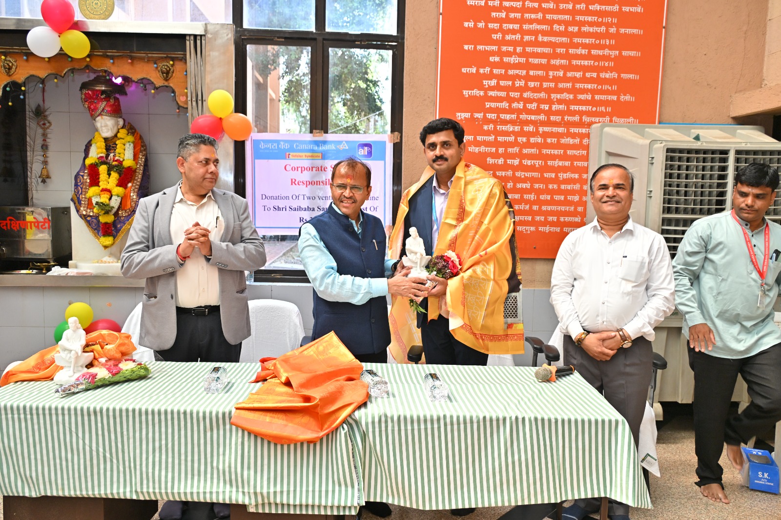 शिर्डी: कॅनरा बँकेच्या सामाजिक उत्तरदायित्व (CSR) उपक्रमांतर्गत श्री साईबाबा हॉस्पिटलला ३५ लाख रुपये किमतीचे दोन अत्याधुनिक व्हेंटिलेटर देणगी स्वरूपात देण्यात आले. या उपकरणांचे विधिवत पूजन श्री साईबाबा संस्थानचे मुख्य कार्यकारी अधिकारी श्री गोरक्ष गाडीलकर (भा.प्र.से.) आणि कॅनरा बँकेचे मुख्य हेड ऑफिसर प्रमोद कुमार सिंग यांच्या हस्ते करण्यात आले.