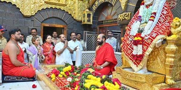 Hon. Shri Ramdas Kadam, Minister, Maharashtra State, visited and took darshan of Shri Saibaba's Samadhi. Following the darshan, he was felicitated by the Deputy Chief Executive Officer, Shri Bhimraj Darade, on behalf of the Shri Saibaba Sansthan.